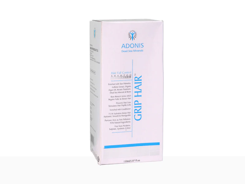 Adonis Grip Hair Fall Control Shampoo is a biotin-enriched nourishing formula crafted to reduce hair fall, enhance thickness, and promote healthy growth from root to tip. Infused with Saw Palmetto, Caffeine Extract, Keratin, and Dead Sea Minerals, it strengthens hair strands, boosts scalp vitality, and prevents breakage. With Pentavitin providing 72-hour hydration and Puricare offering pollution protection, this shampoo leaves hair smooth, manageable, and voluminous. Made with 95% natural ingredients, it is free from parabens, sulphates, and synthetic colors, making it suitable for regular use.