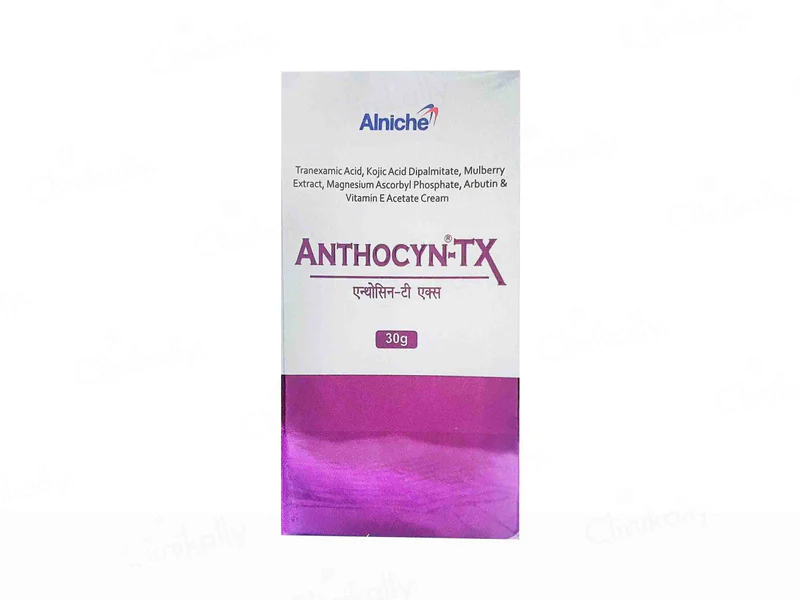 Anthocyn-TX Cream is a scientifically advanced depigmenting treatment formulated with 10% Tranexamic Acid, Kojic Acid Dipalmitate, Arbutin, and Vitamin E Acetate to target melasma, chloasma, UV-induced pigmentation, and post-inflammatory hyperpigmentation. Enriched with Mulberry Extract and Magnesium Ascorbyl Phosphate (Vitamin C), it reduces dark spots, brightens skin tone, and offers antioxidant protection. This dermatologically effective formula helps inhibit melanin production while improving skin clarity and radiance. Suitable for daily use, Anthocyn-TX Cream visibly fades discoloration, evens out complexion, and restores skin luminosity over time.