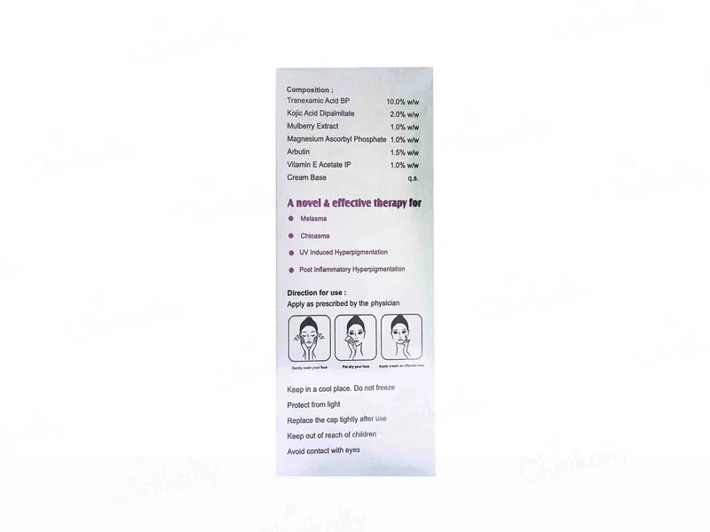 Kojic Acid Dipalmitate (2% w/w) + Magnesium Ascorbyl Phosphate (1% w/w) + Tranexamic Acid BP (10% w/w) + Arbutin (1.5% w/w) + Vitamin E Acetate (1% w/w) + Mulberry Extract (1% w/w)