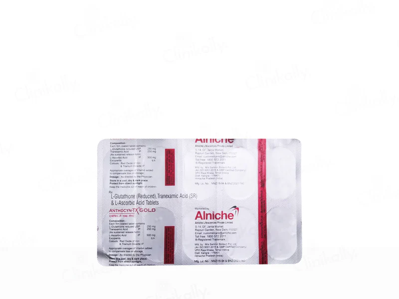 Anthocyn-TX Gold Tablet is an advanced skincare solution designed to target hyperpigmentation issues, including melasma, chloasma, UV-induced pigmentation, and post-inflammatory pigmentation. It combines the power of Tranexamic Acid, Glutathione, and L-Ascorbic Acid to brighten the skin, reduce wrinkles, and improve elasticity. The formula works by inhibiting melanin production and neutralizing free radicals, leaving the skin visibly clearer and more even-toned. The sustained-release mechanism ensures better absorption and long-lasting results, making it highly effective for long-term skincare support.