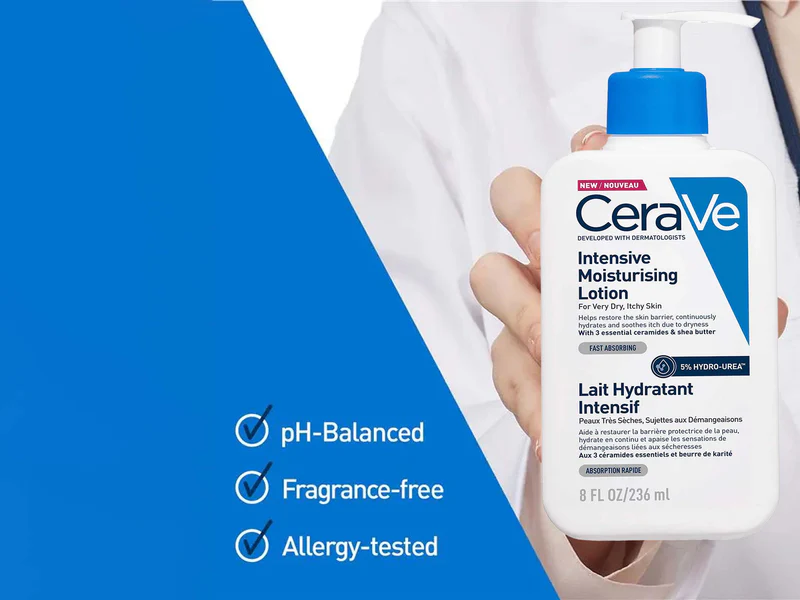 CeraVe Intensive Moisturising Lotion for Very Dry & Itchy Skin is a fast-acting, dermatologist-developed lotion that relieves and defends against five key signs of dryness—itching, tightness, roughness, flaking/scaling, and redness/discoloration. Featuring MVE Delivery Technology, it provides 72-hour hydration with ceramides, hyaluronic acid, and 5% Hydro-Urea™, soothing and restoring the skin barrier for all skin types, especially very dry skin.
