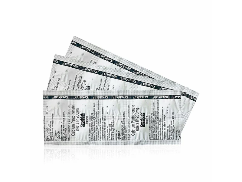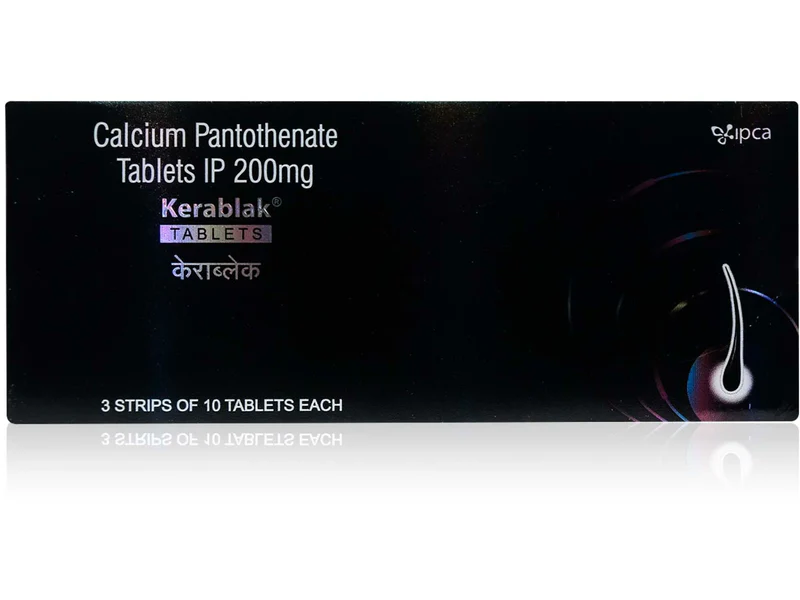 IPCA Kerablak Tablet is a potent hair health supplement formulated with D-Calcium Pantothenate, a vital component of Pantothenic acid. This tablet helps reduce hair fall and promotes the growth of new and existing hair by nourishing the hair follicles from within. By enhancing the water content and elasticity of hair, it strengthens hair from the roots and supports overall hair vitality. Suitable for all hair types, Kerablak ensures healthier, stronger hair.