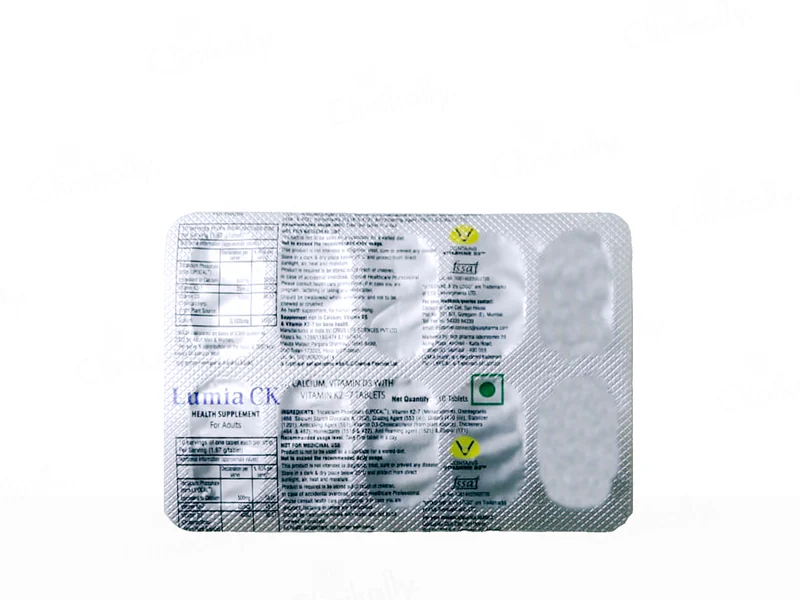 Lumia CK Health Supplement Tablet is a scientifically balanced formulation for adults designed to support bone strength, calcium absorption, and cardiovascular health through a synergistic blend of essential nutrients. It contains key ingredients such as Calcium, Vitamin D3, Vitamin K2-7, Magnesium, and Zinc which collectively enhance bone mineral density and optimize calcium metabolism. Calcium serves as the foundation for strong bones and teeth, while Vitamin D3 promotes calcium absorption from the gut. Vitamin K2-7 helps in proper calcium deposition in bones and prevents arterial calcification, ensuring bone and heart protection. Magnesium aids muscle and nerve function, and Zinc supports bone regeneration and immunity. This supplement is ideal for adults requiring enhanced bone support or suffering from calcium or Vitamin D deficiencies, helping maintain long-term skeletal health when taken regularly as prescribed by healthcare professionals.